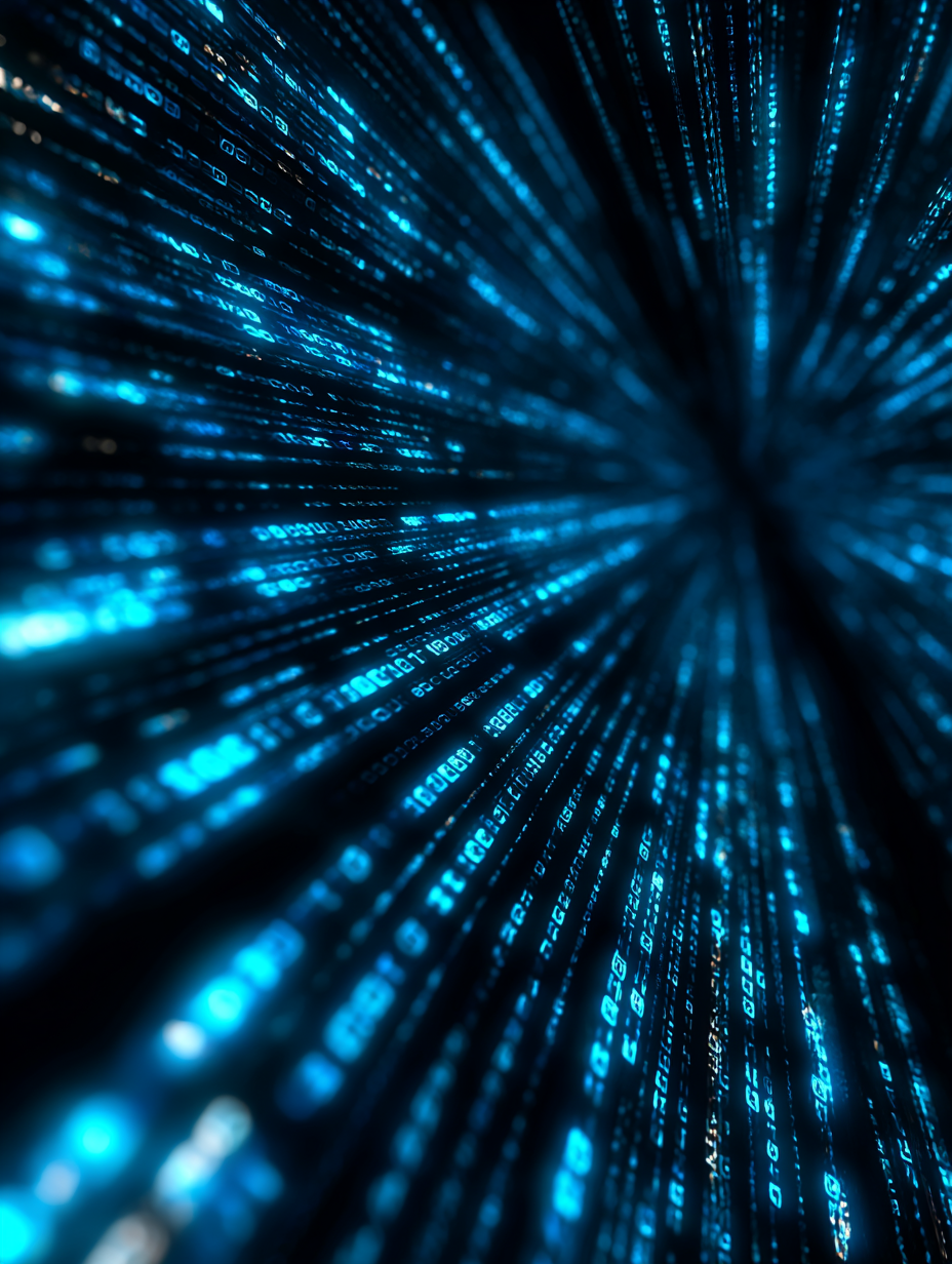 Digital data streams with glowing blue binary code and numbers in a tunnel-like pattern.