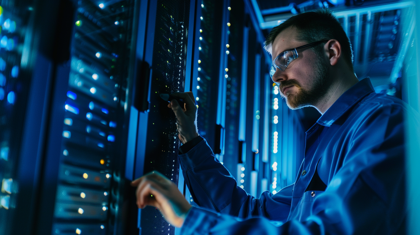 A technician working in a data center, adjusting server equipment in a room filled with racks of servers, with cool blue lighting.